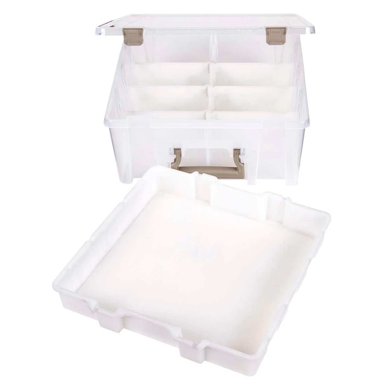 Customize your storage with this Double Deep plastic storage box with removable dividers and a bonus removable tray. This clever storage solution is perfect for large, bulky supplies for any crafter, stitcher, or quilter. It’s perfect for storing fat quarters! The storage box has removable dividers that allow you to customize your storage for any crafting or stitching supplies. The Double Deep container features a hinged lid and carrying handle, making it easy to transport your supplies. The clear sides of the container let you easily see what is inside, or you can use labels to identify the contents. The 14 x 15¼ x 6¼” (36 x 38.5 x 15.9cm) Double Deep storage container is designed to fit within the Super Satchel Cube system (sold separately), but it can also be stored on shelf in your crafting or sewing space. This bundled set also includes a removable tray that fits inside the Double Deep box, perfect for holding papers, patterns, and more. Contents not included.