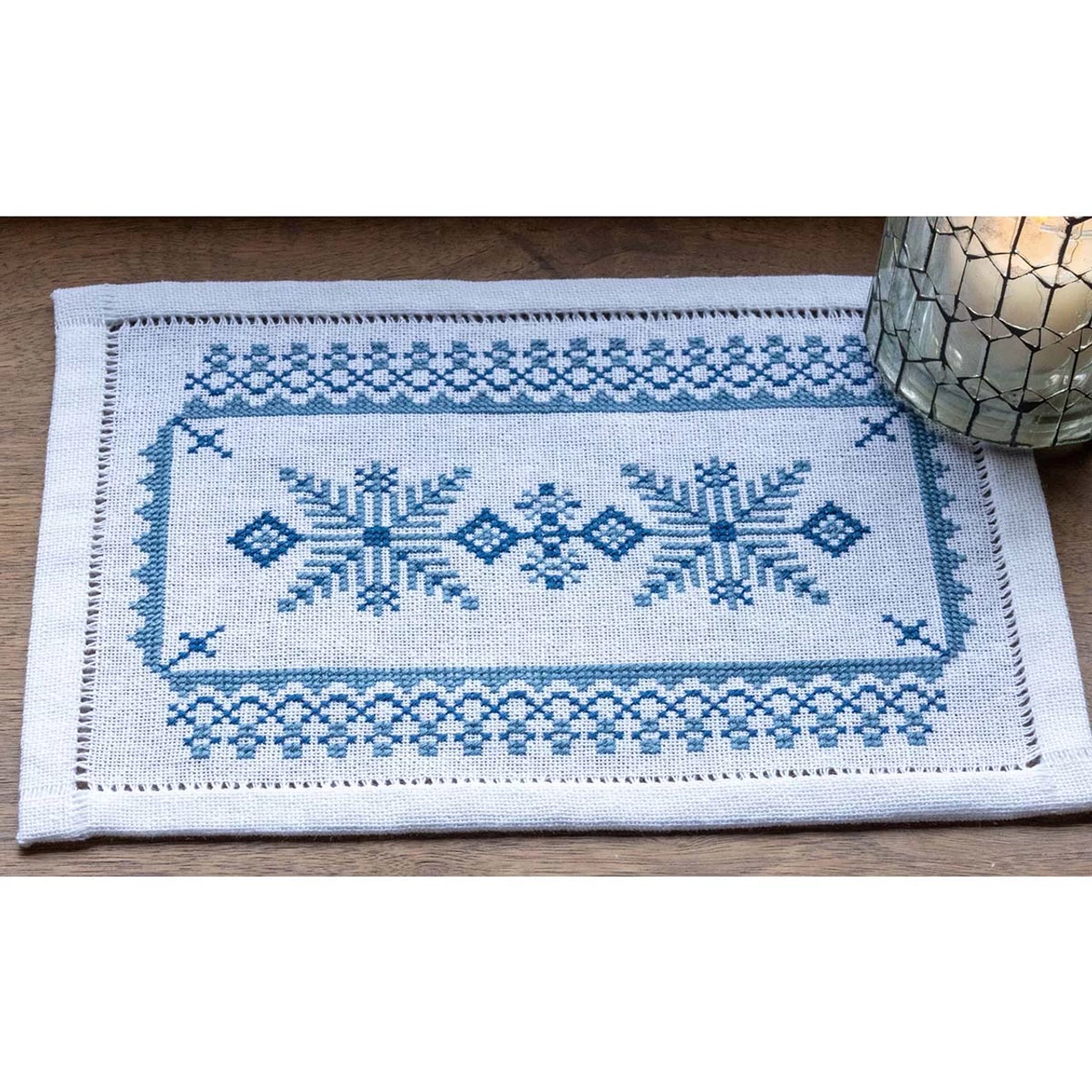 • Design features two blue Scandinavian stars surrounded by geometric shapes with a repeating border stitched in blue.