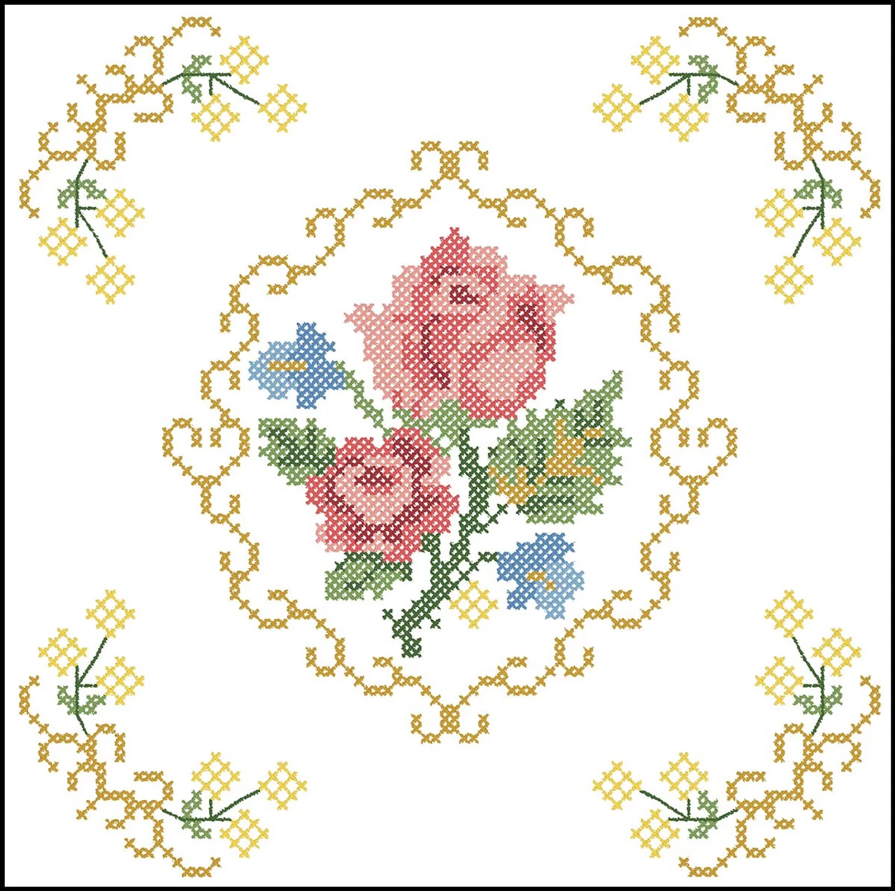 A pretty bouquet creates a fabulous display stitched on a beautiful quilt. Stamped for cross-stitch on white polyester/cotton fabric. Six 18 × 18″ (46 x 46cm) quilt blocks. Imported.