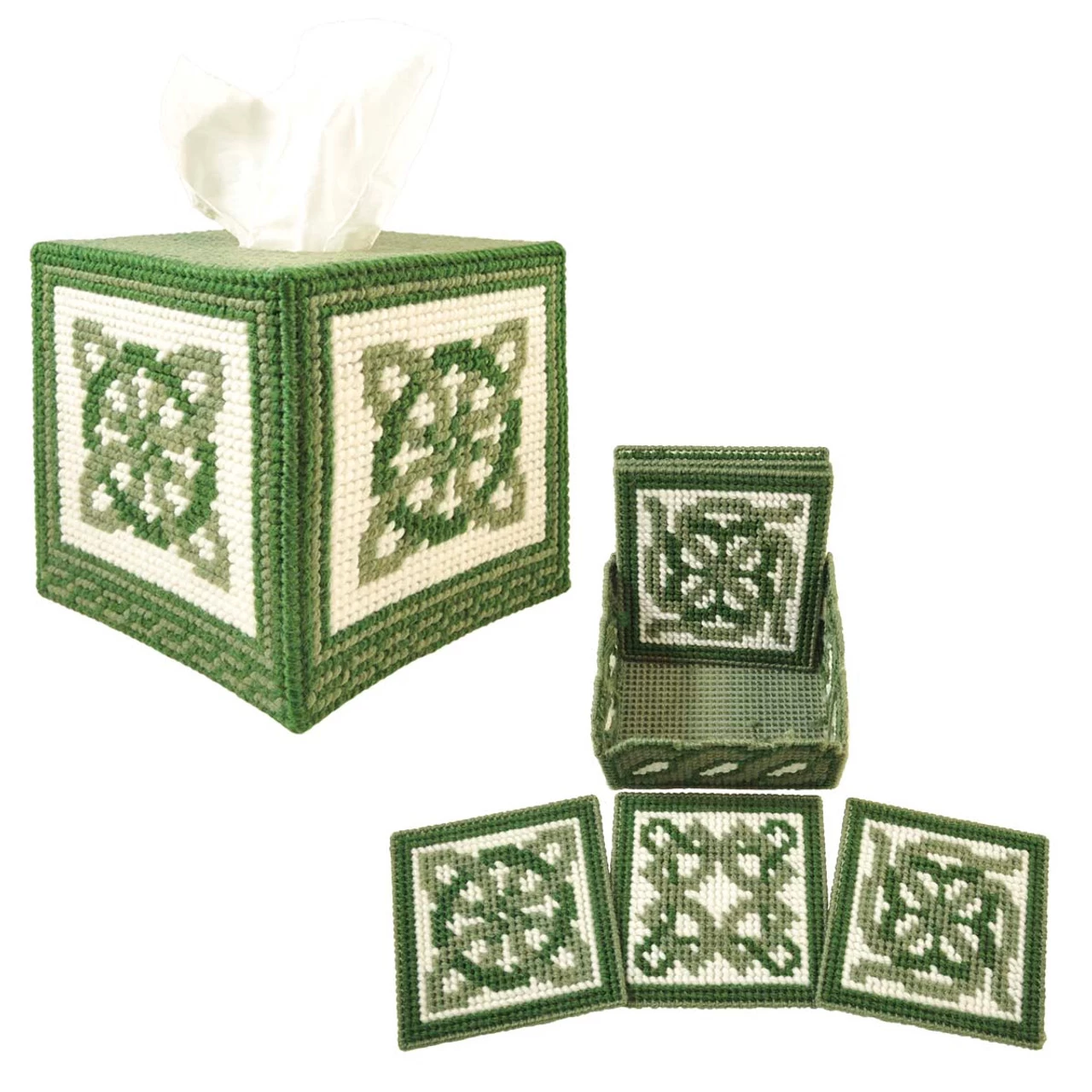 Traditional Celtic symbols bring a classic elegance to your décor. Kits include 7-mesh plastic canvas, acrylic yarn, and needle. Set of six 4½ x 4½” (11.4 x 11.4cm) coasters and holder; 5 x 5½ x 5″ (12.7 x 14 x 12.7cm) tissue box cover. Imported.