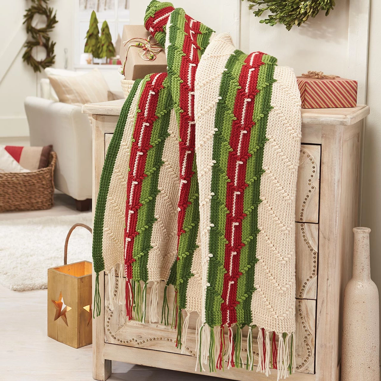 Elongated stitches create textural chevrons across the vertical stripes of this holiday-hued afghan. Kit includes Herrschners Worsted 8 Yarn, a clear vinyl storage bag, a label for personalization, and intermediate crochet instructions. 57 × 63″ (145 x 160cm). Imported.