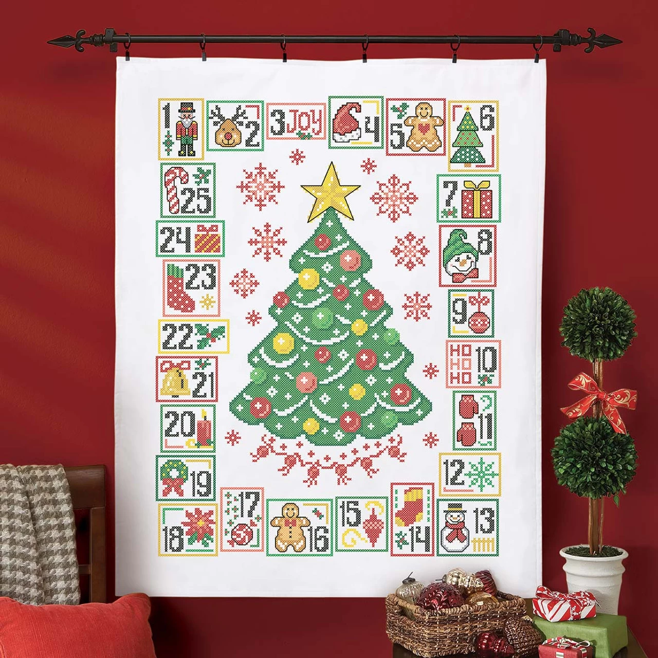 • Stamped cross-stitch design features a decorated Christmas tree surrounded by snowflakes and a frame numbered blocks counting down to Christmas day, decorated with stockings, holly, bells, mittens, ornaments, poinsettias, candy canes, gingerbread men, snowmen, and other holiday symbols.