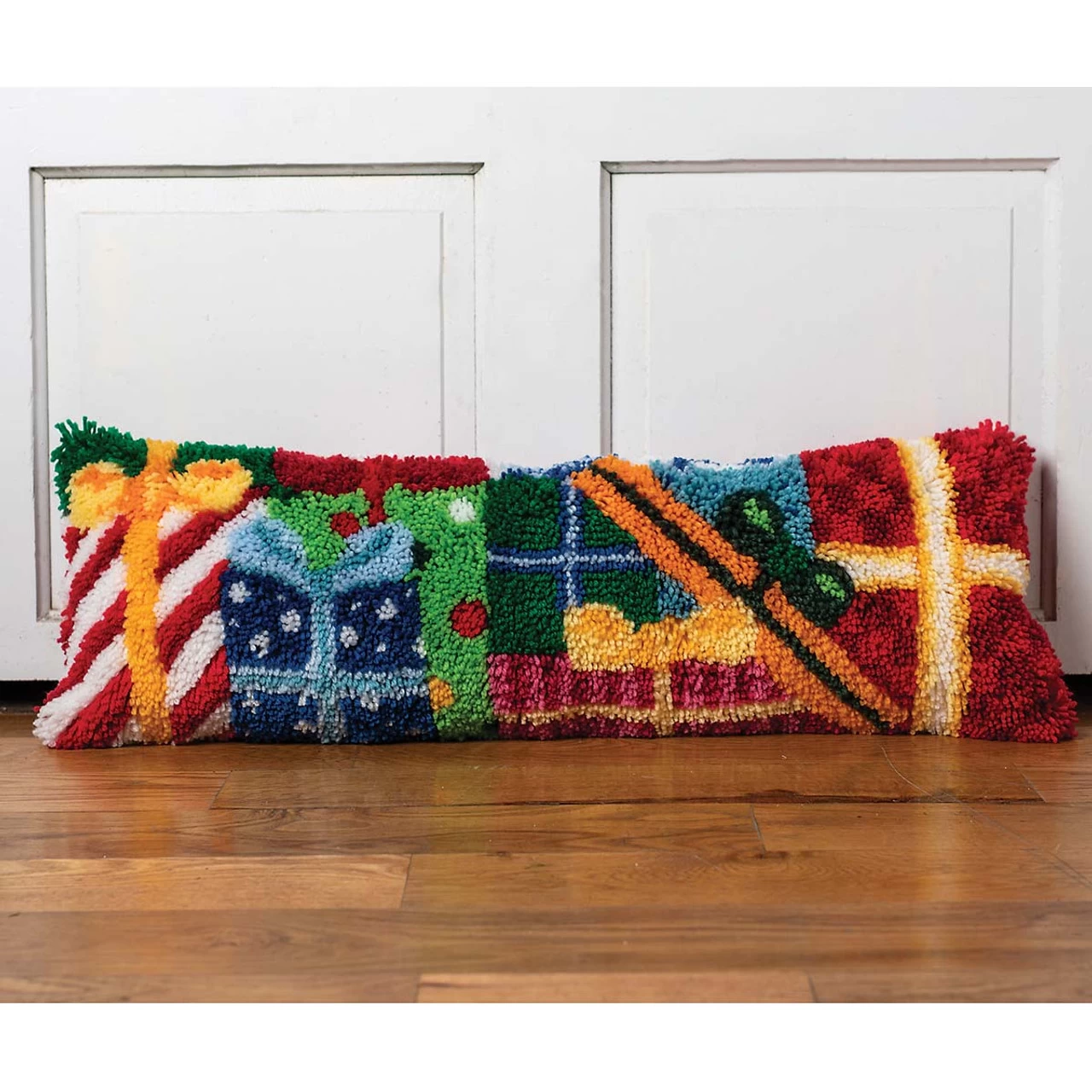 A pile of latch hook presents will keep out cold drafts! Crafters of all ages and skill levels enjoy the variety latch hook provides. Finished projects can be made into pillows, wall hangings, rugs, and more. Kit includes 3.75-mesh gridded canvas, lofty pre-cut 100% acrylic yarn, clear vinyl storage bag, easy-to-follow chart, and instructions. Latch hook tool not included. The higher-gauge canvas of this project allows for a high level of detail in the finished design. 36 x 12″ (91 x 30cm). Imported.