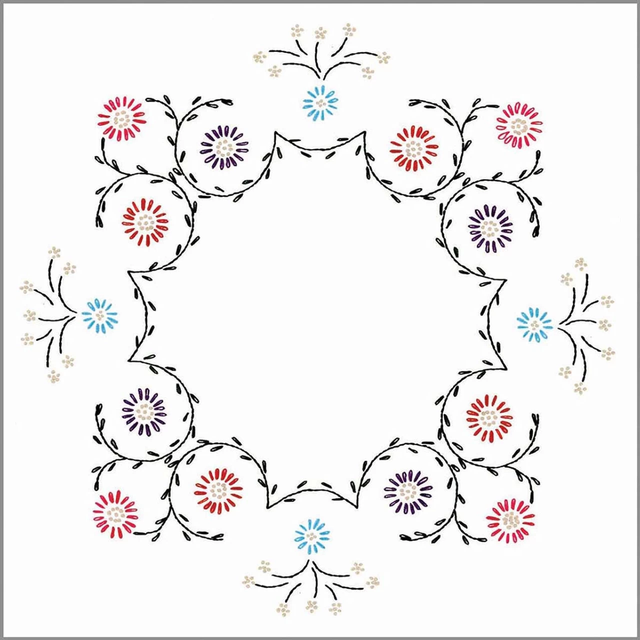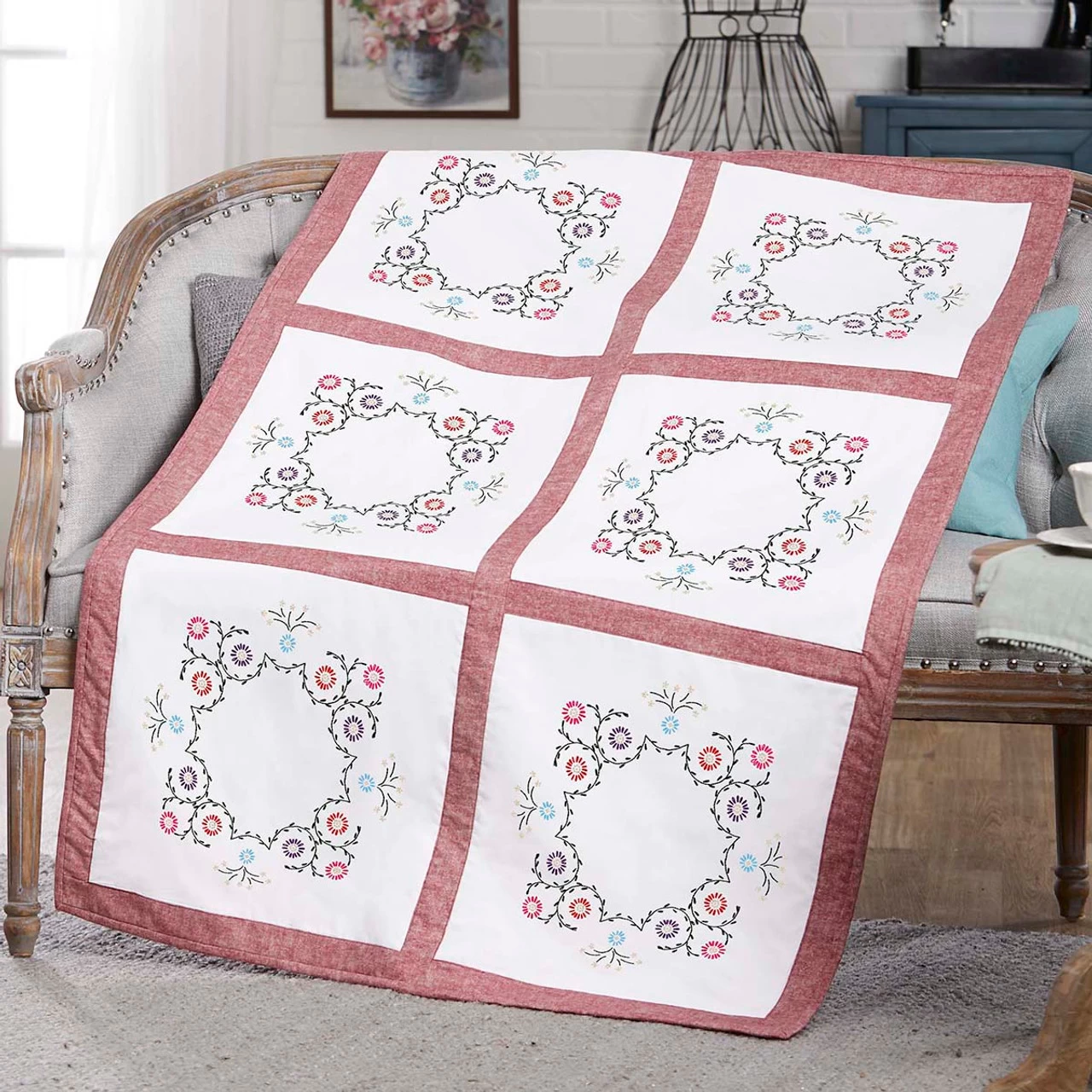 This floral quilt block design features a wreath of little pink, blue, and purple flowers and dark green vines. The designs are stamped for embroidery on white cotton/polyester fabric. Simply follow the easy-to-read chart and instructions to stitch the designs. The completed quilt blocks can be finished as a quilt but also are perfectly sized to make throw pillows. Floss, needle, and finishing fabrics are not included. Each quilt block measures 18 x 18″ (46 x 46cm). Imported.