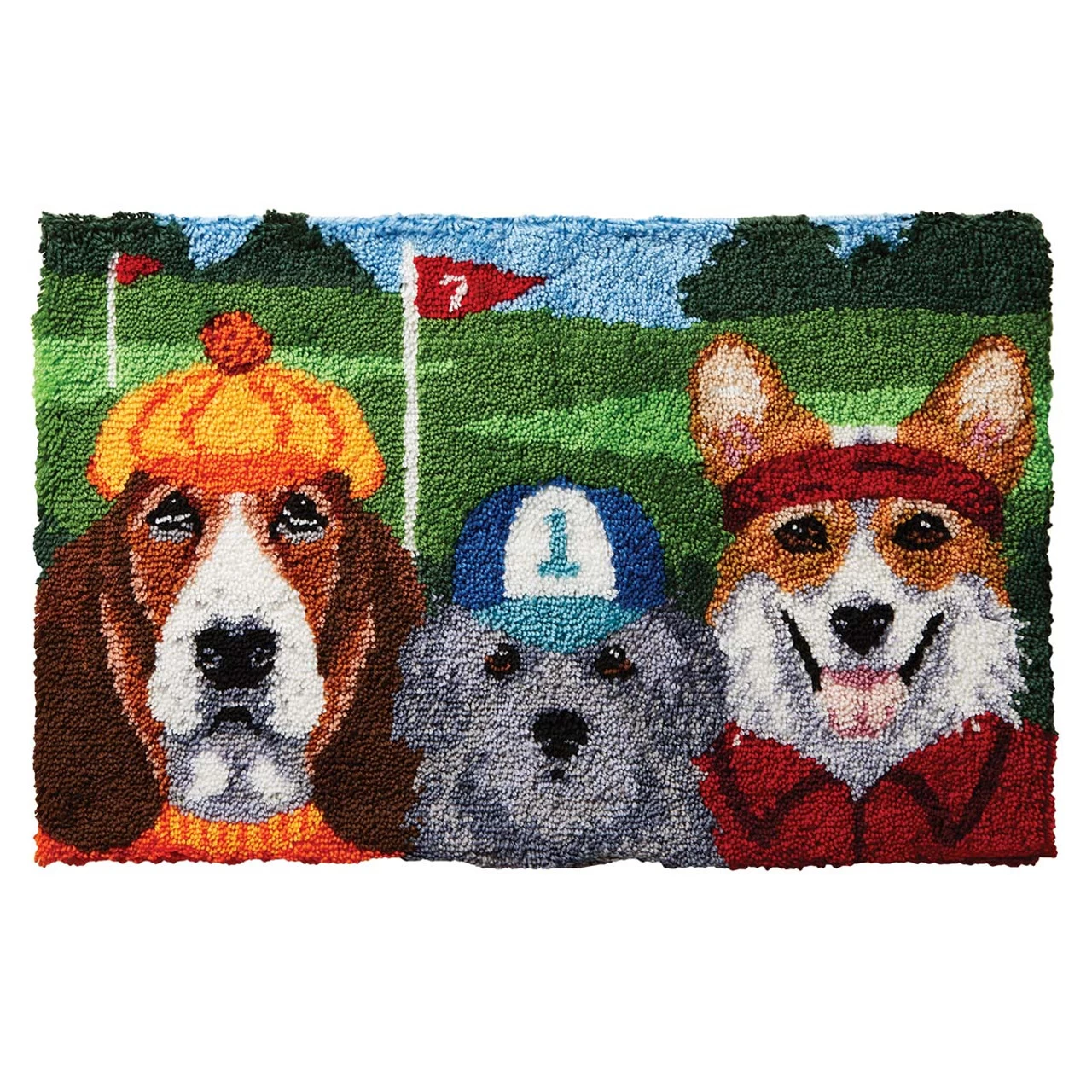This handsome trio of pups is a hole-in-one for golfers and dog lovers alike! Crafters of all ages and skill levels enjoy the variety latch hook provides. Finished projects can be made into pillows, wall hangings, rugs, and more. Kit includes 3.75-mesh gridded canvas, lofty pre-cut 100% acrylic yarn, clear vinyl storage bag, easy-to-follow chart, and instructions. Latch hook tool not included. The higher-gauge canvas of this project allows for a high level of detail in the finished design. 40 x 27″ (102 x 69cm). Imported.