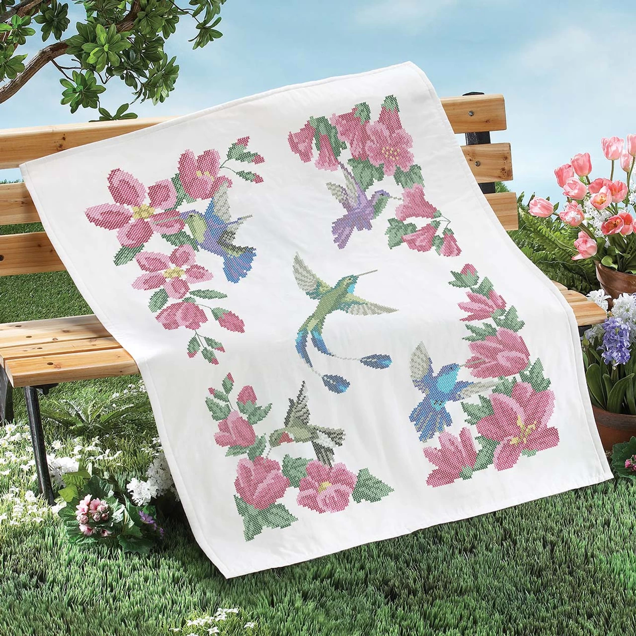 • Stamped cross-stitch design features five species of hummingbirds with brightly colored feathers visiting pink flowers that form a frame around this beautiful bird and blossom lap quilt.