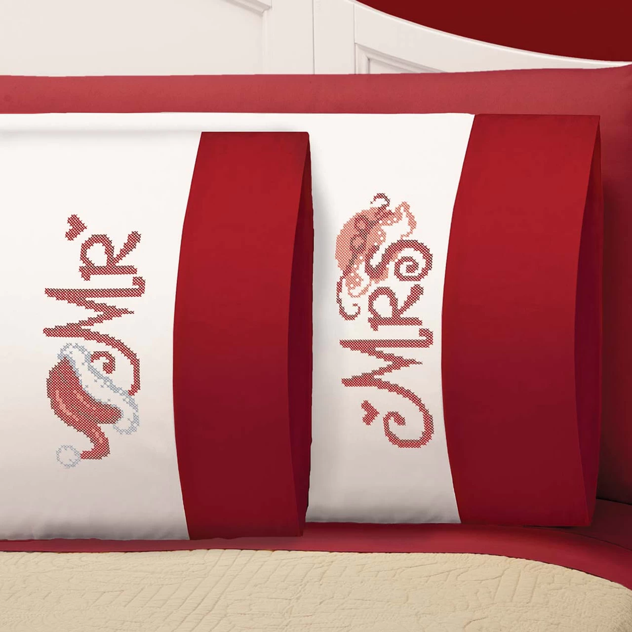 These coordinating pillowcases are perfect for you and your spouse or as a fun Christmas gift for newlyweds. Stamped for cross-stitch on white polyester/cotton pillowcase with red cuff. Set of two. 20 x 30″ (51 x 76cm). Imported.