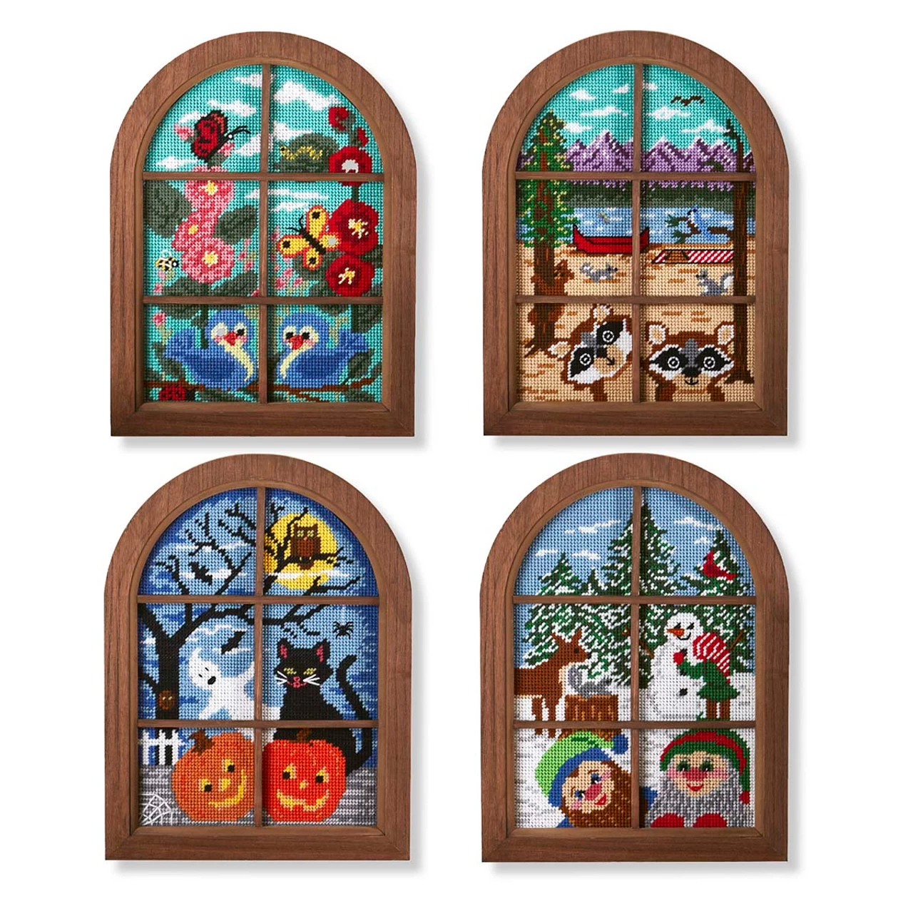 • The designs feature a haunting Halloween scene with a black cat, ghost, bat, spider, owls full moon, jack-o’-lanterns, and spider webs; a pair of bluebirds perched on a branch peeking in the bottom windowpanes while pink and red flowers, butterflies, a bumble bee, a ladybug, and a caterpillar complete the flower garden scene; three elves enjoying a winter day playing in the snow by building a snowman under the watch of a deer, a squirrel, and a cardinal perched in the snow-covered trees; and a pair of racoons peeking in the bottom windowpanes as bears, squirrels, and a blue jay enjoy the beach, where a canoe and picnic basket and blanket sit on the shore of the mountain lake.