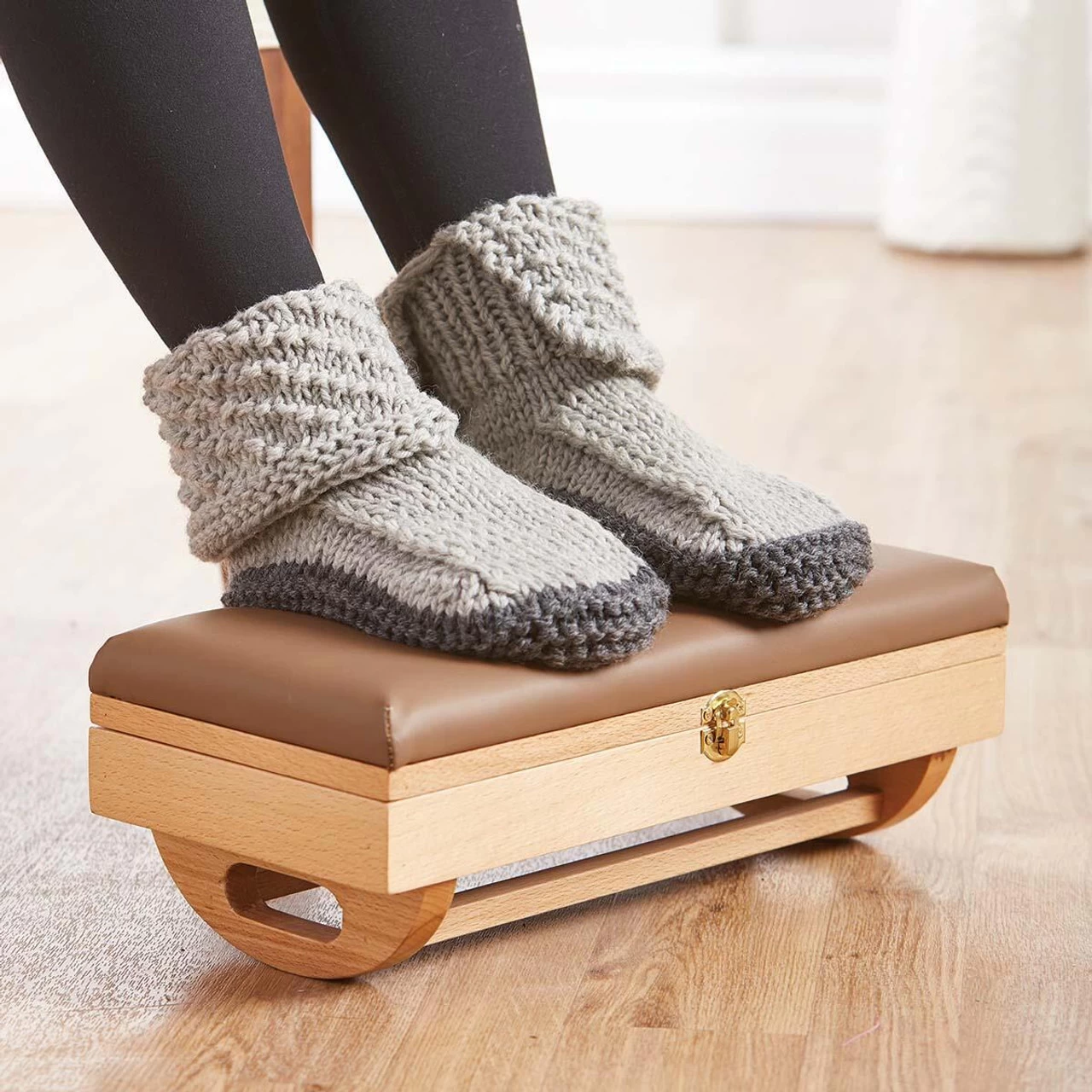 Storage meets comfort in this clever padded rocking stool! This clever little wooden rocking stool is much more than a soft place to rest your feet. The padded cushion is on a latched lid that lifts to reveal an approximately 13 × 6 × 1″ (33 x 15.2 x 2.5cm) storage space perfect for storing for notions and supplies! Keep this rocking stool by your favorite stitching chair to make working on your project even more enjoyable as you ease the strain on your feet and legs and enjoy the gentle rocking motion as you stitch. The small size of only 16 × 8 × 5″ (41 x 20.3 x 12.7cm) means it can also be tucked under your desk as you work in the office!