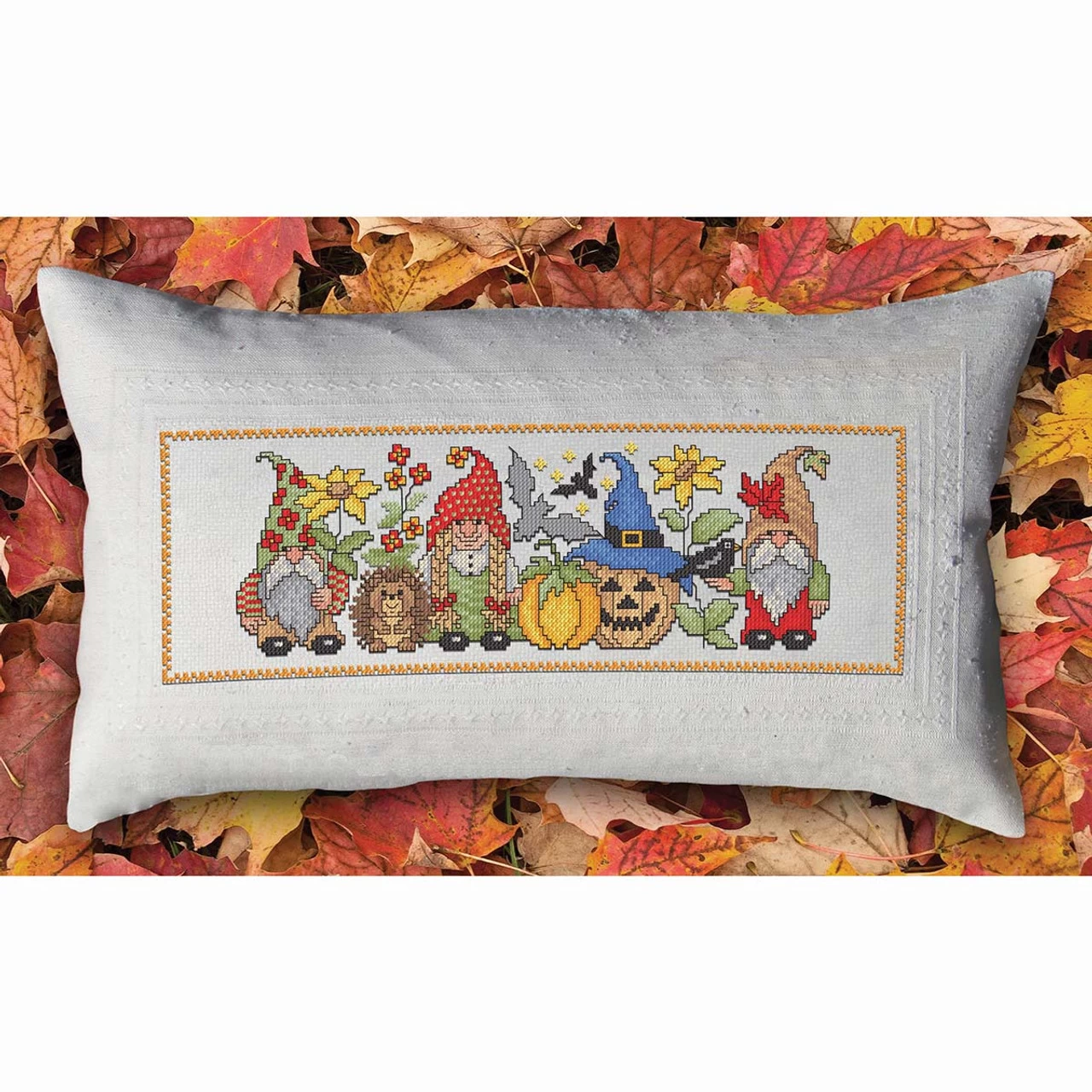 • Design features three gnomes in fall clothes standing in a sunflower field with a jack-o’-lantern in a witch’s hat, a hedgehog, a pumpkin, a crow, and bats.